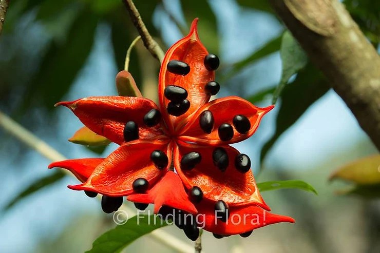 One of the pods in bright red colour burst and out came the black seeds and the water on the pods dripped down the black seed. I could not believe my eyes. climbed up a few rocks next to me to get as close as possible to the fruit ( which I thought was a flower all along) and caught this moment before it could disappear. There was just this one tree in the whole village, but as we travelled towards shnongpdeng a few days later I saw many more such trees but really big full grown trees which were abou