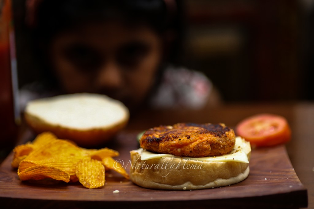 “Amma, I finished arranging it like masterchef. I don’t like the lettuce or the chilly or the onion and so I did not put it. I like ketchup on the side. This burger looks yummy. Can I eat it now?” She said. So here it is – a burger with missing ingredients. But definitely her kind of burger.